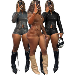 Conjunto de dos piezas de moda europea americana para mujer, Top de motorista con cuello levantado, pantalones cortos de manga larga con cremallera bidireccional, Top de cuero para mujer